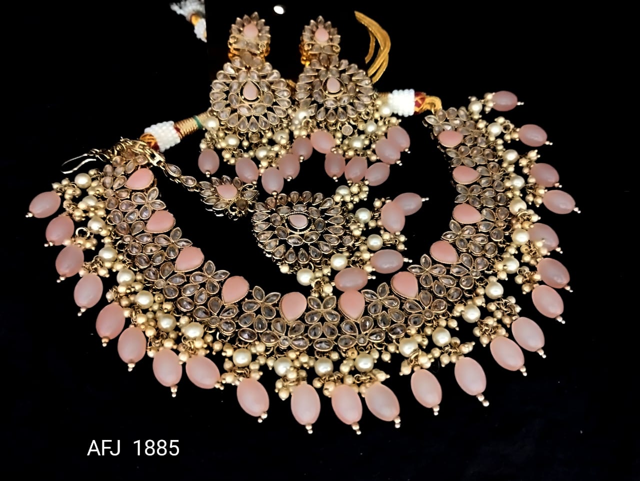Elegant Kundan Necklace Set In Monalisa Stone Work And Hydro Beeds At Bottom With Matching Studded Drop Long Earrings And Tika