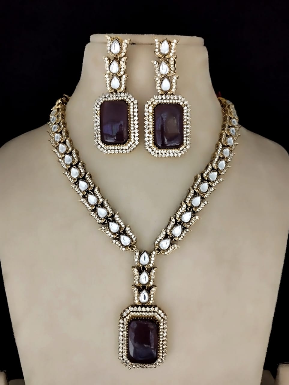 Moissanite Kundan Necklace Set In Ad Stone Work With Matching Studded Drop Earrings