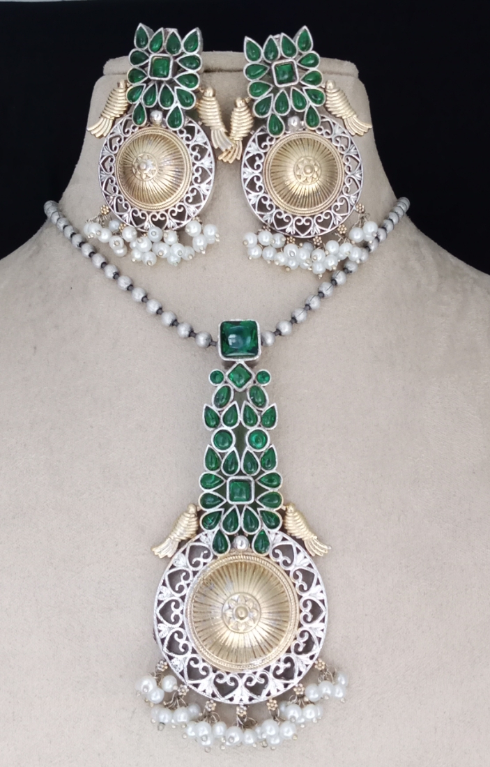 BEAUTIFUL ONYX CRYSTAL PENDANT MALA SET ATTACHED WITH BIG IN TYANI KUNDAN, CARBING STONE AND AD STONE WORK JHUMKI DANGLING AT BOTTOM WITH MATCHING STUDDED DROP EARRINGS