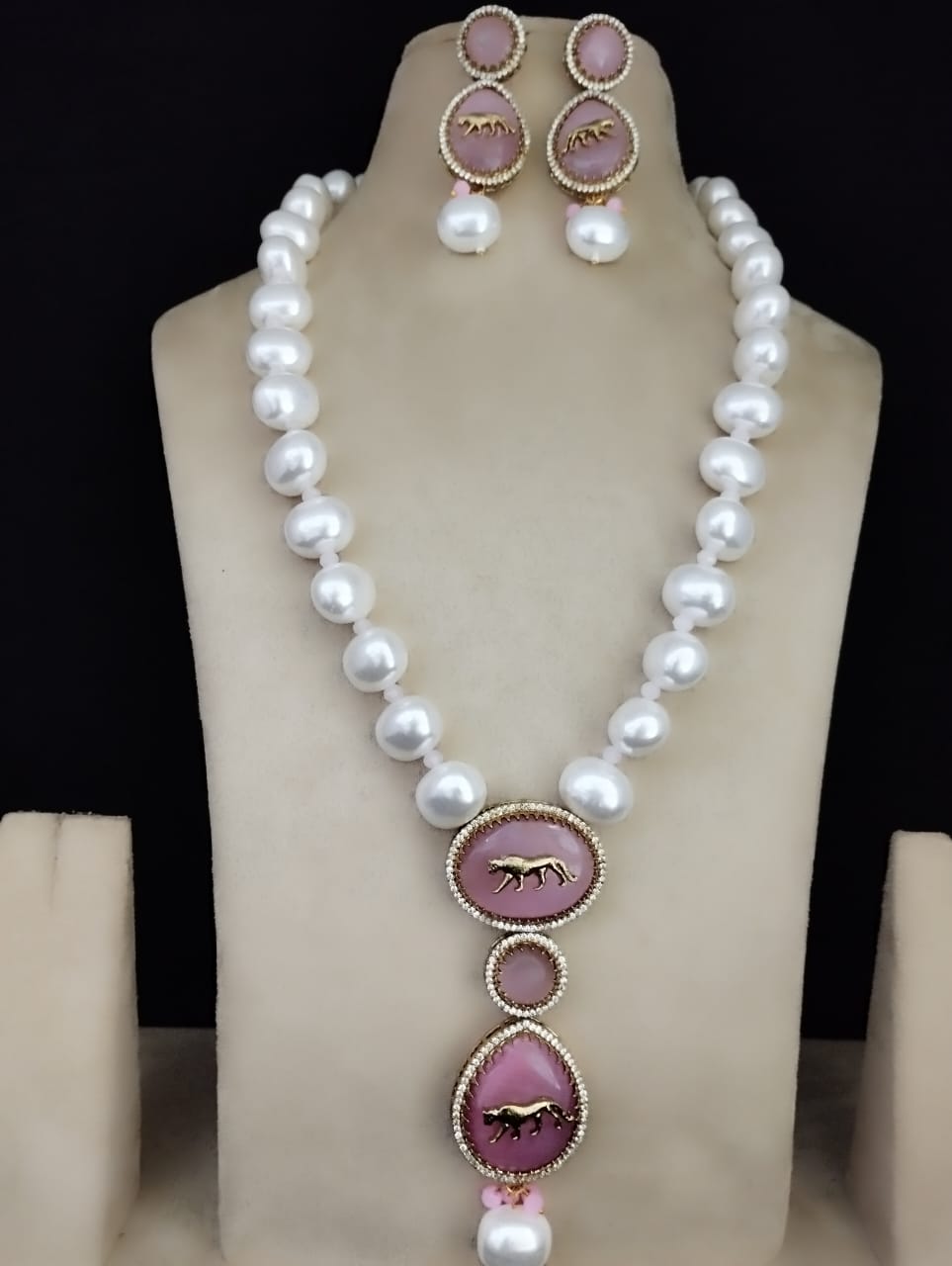 Sabyasachi Inspired Bollywood Style Long Necklace Set In Singapuri Pearl and Monalisa & Ad Stone Work With Studded Drop Earrings