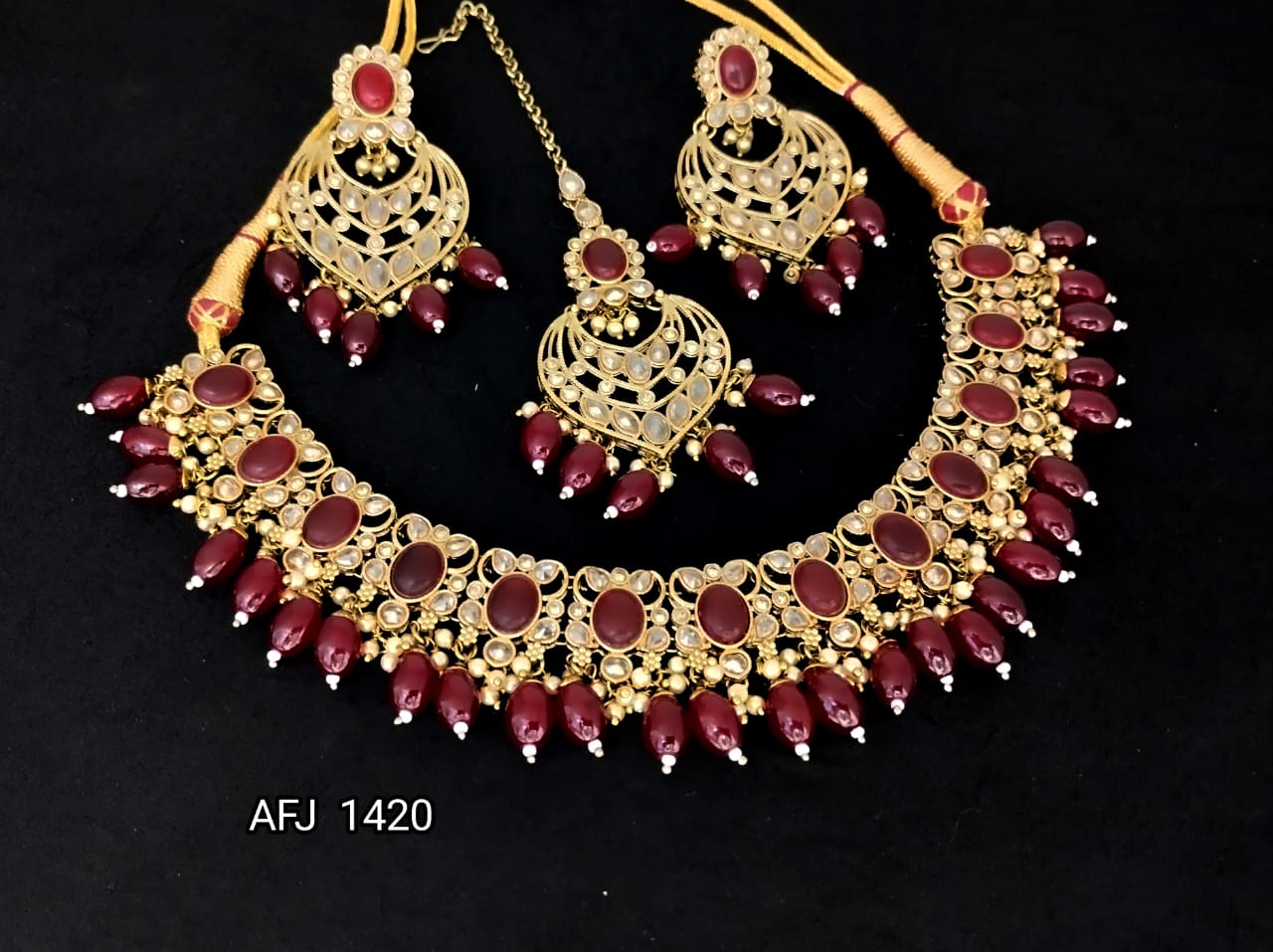 THIS NECKLACE INTRICATE BEAUTIFUL PATTERN WITH REVERSE AD CREATING ANTIQUE APPEARANCE,BASE MATERIAL IS COPPER BRASS ANTIQUE TONED HYDRO BEEDS DANGLING AND SMALL REVERSE AD STONES ADDING ELEGANCE OVER ALL THE NECKLACE WITH DROP EARRINGS IN REVERSE AD AND HYDRO BEEDS, AND THE MAANG TIKA FEATURES SIMILAR PATTERNS