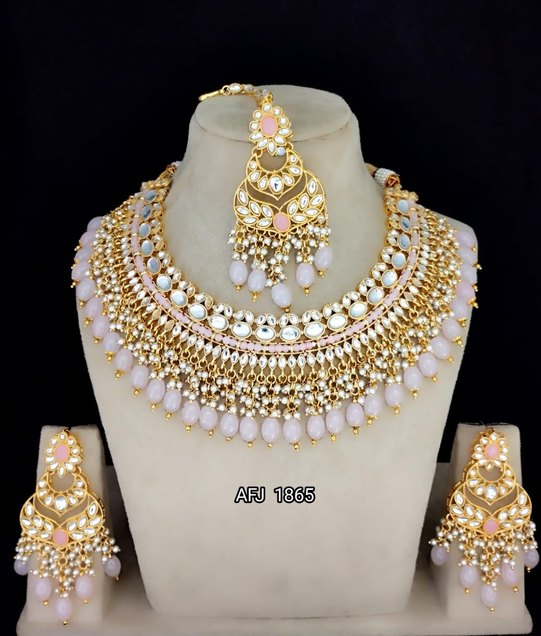 Traditional Kundan Necklace Set Hydro Beeds At Bottom With Matching Studded Drop Earrings And Tika