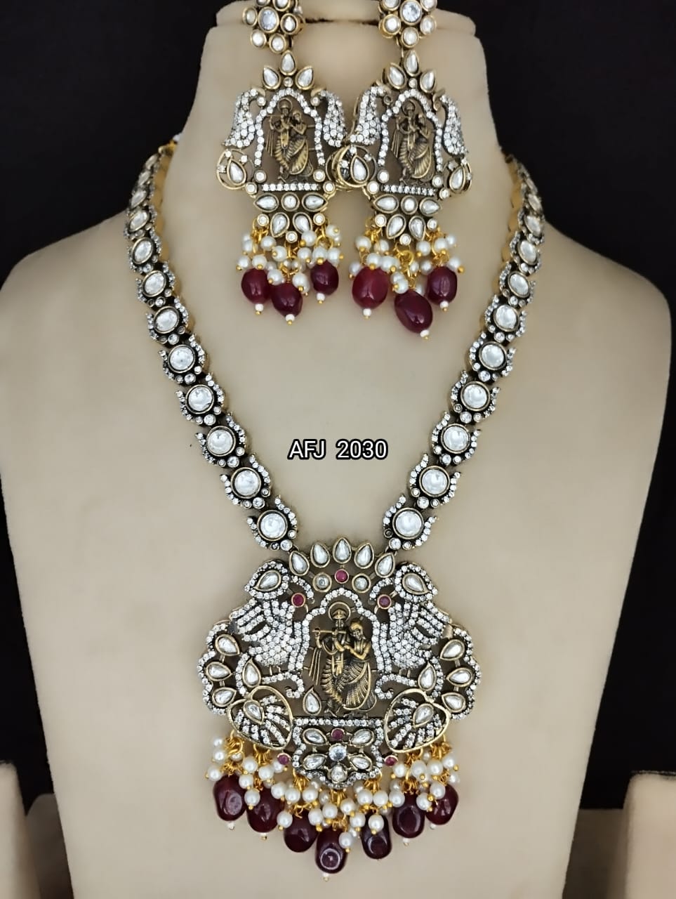 Traditional Radha Krishna Motive Moissanite Kundan And Ad Stone Work Belt Pendant Set With Matching Drop Earrings