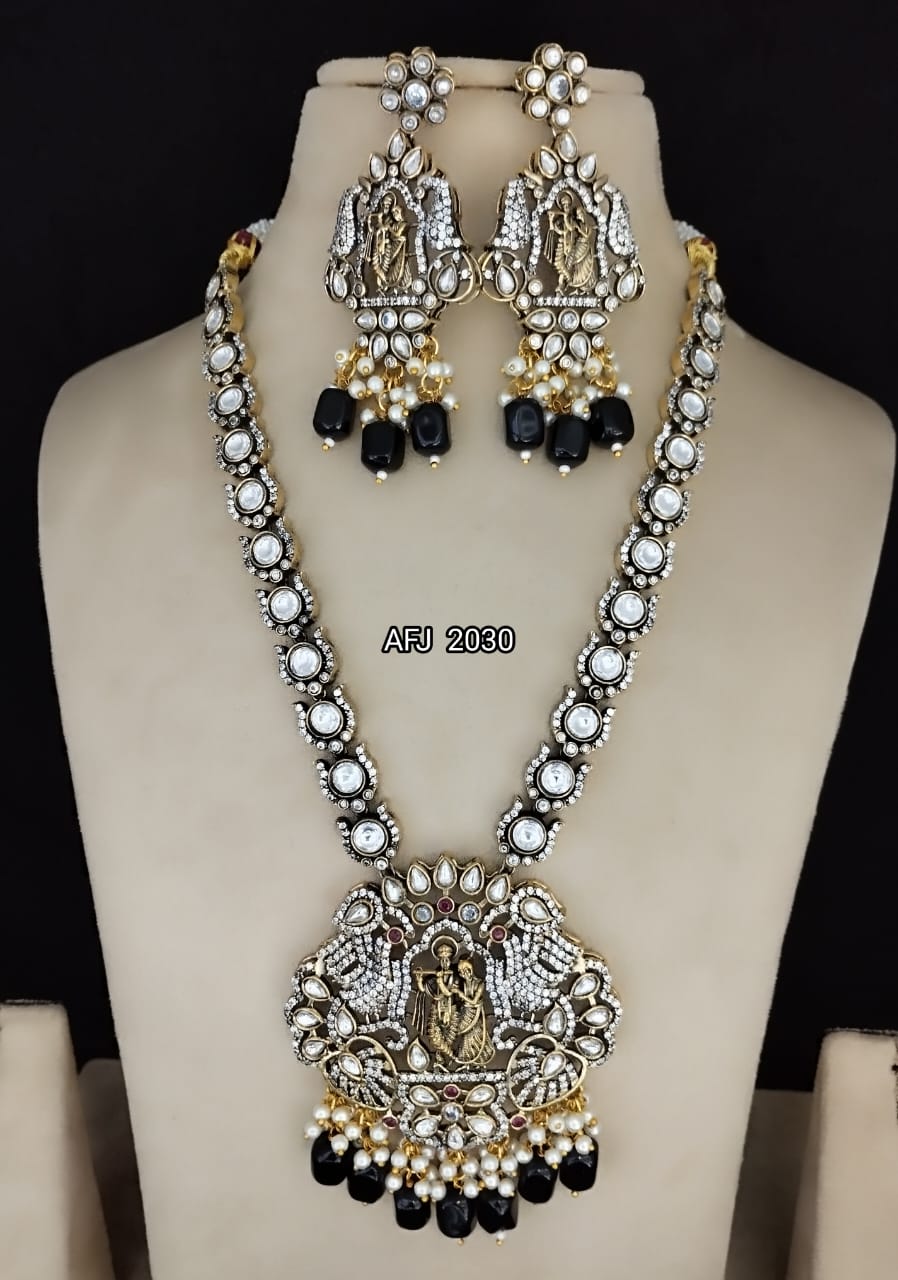 Traditional Radha Krishna Motive Moissanite Kundan And Ad Stone Work Belt Pendant Set With Matching Drop Earrings